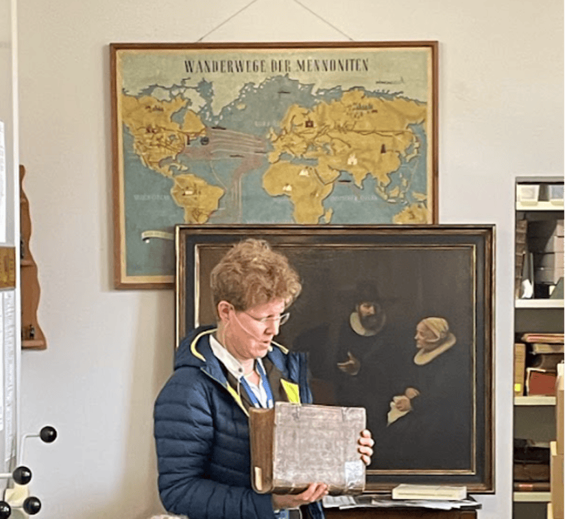 My job as taking up the rear for a few extra pictures is convenient today as we begin in the small town of Weierhof where the Mennonite Research Centre is based. This sleepy farming village has some ancient houses, farmyards, Mennonite cemetery and church. We are introduced to Astrid von Schlachta who give us an entertaining overview of the Centre, allowed us to touch, feel and smell a 500 year old bible, an ancient copy of the Martyrs Mirror, miniature Russian books with the Psalms in them and some copper plates dating back to the 1700’s that were used for the graphic printing in the Martyrs mirror. We can interact with history normally kept away from the public behind glass windows, so this stop was particularly impactful to us all.