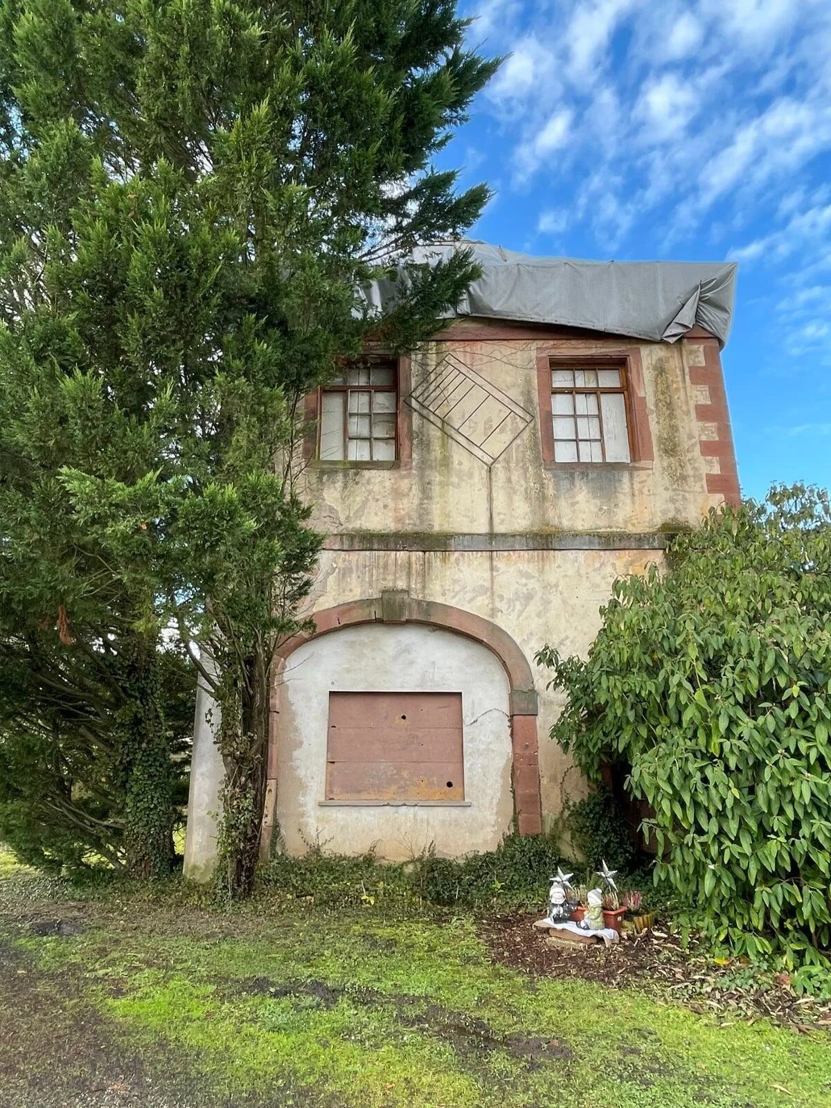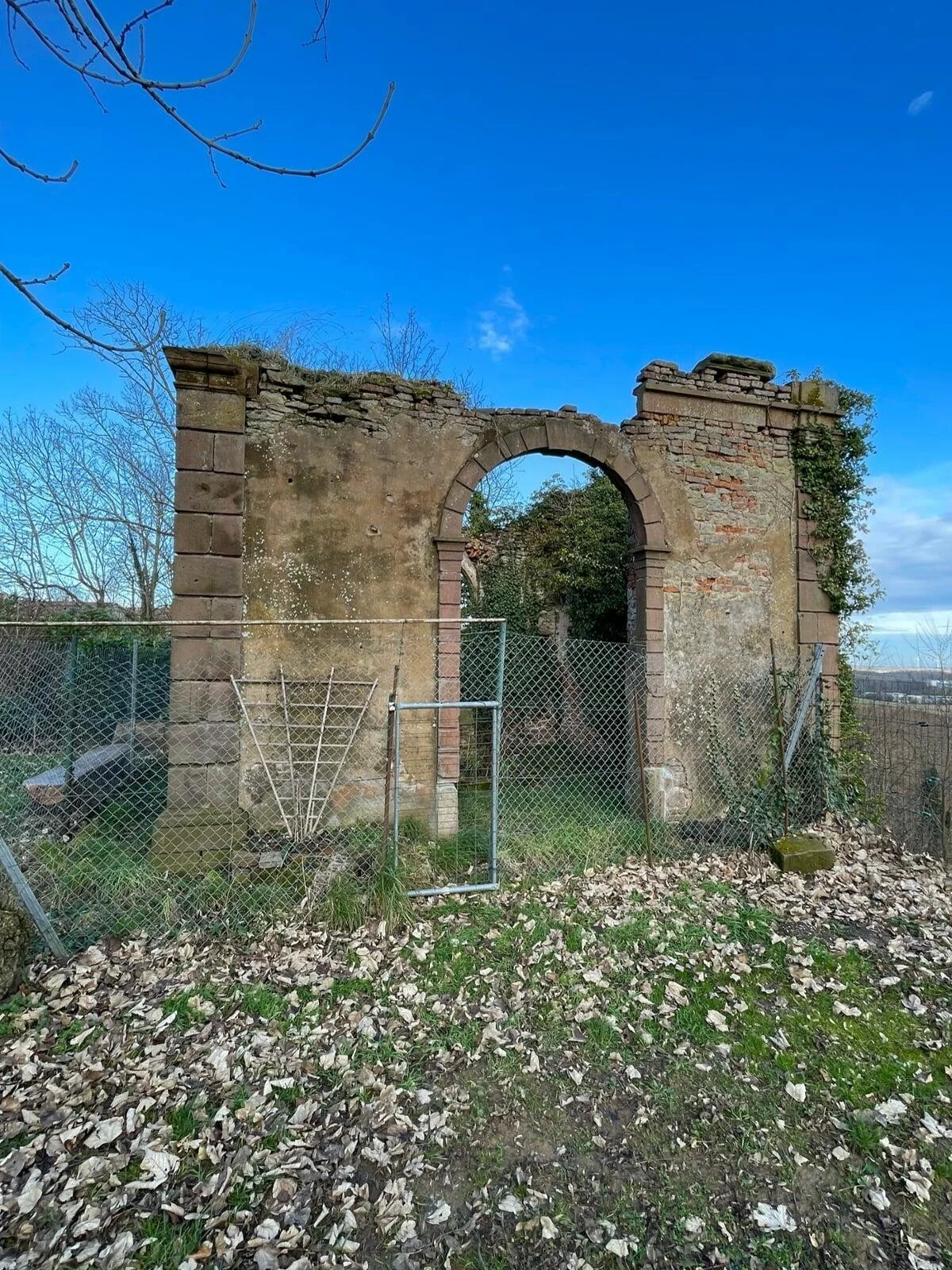 Thanks to Google Maps and a bit of research, I was able to find the remnants of the Geisberg gate (as mentioned in the article). Now, it looks like a dilapidated, uninhabitable house, tired and sagging with tarps covering the roof in a feeble attempt to keep out moisture. The structure seems ineffective, with gaping holes in the doors and boarded-up windows. Modern homes have been built around what would have been the castle grounds. Across the road from the gate, a Mennonite church stands quietly, and as we explored the area, we discovered other ruins.